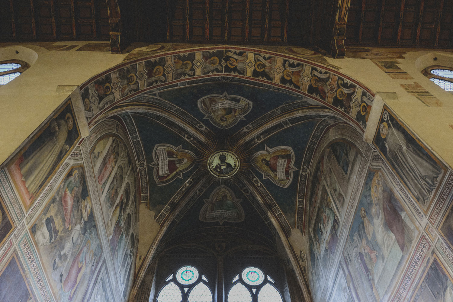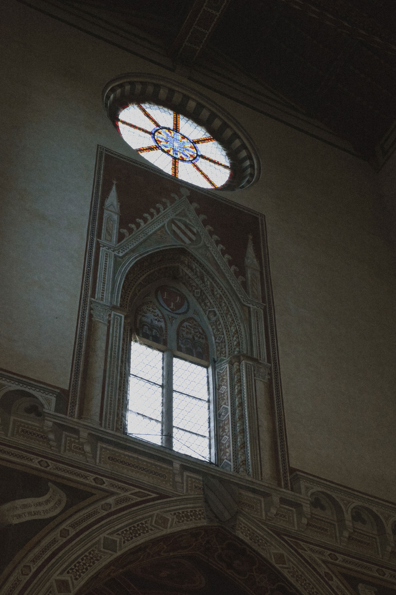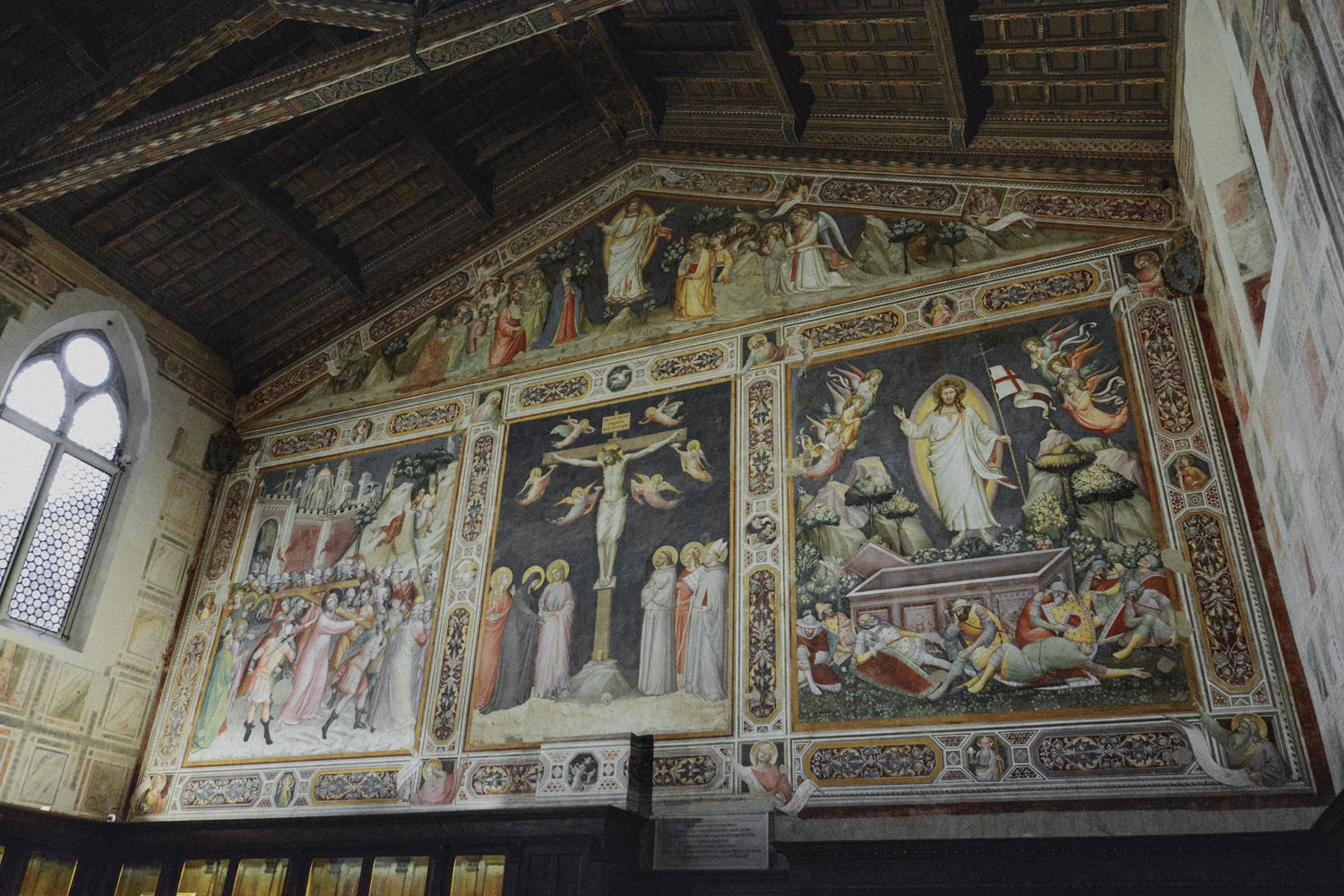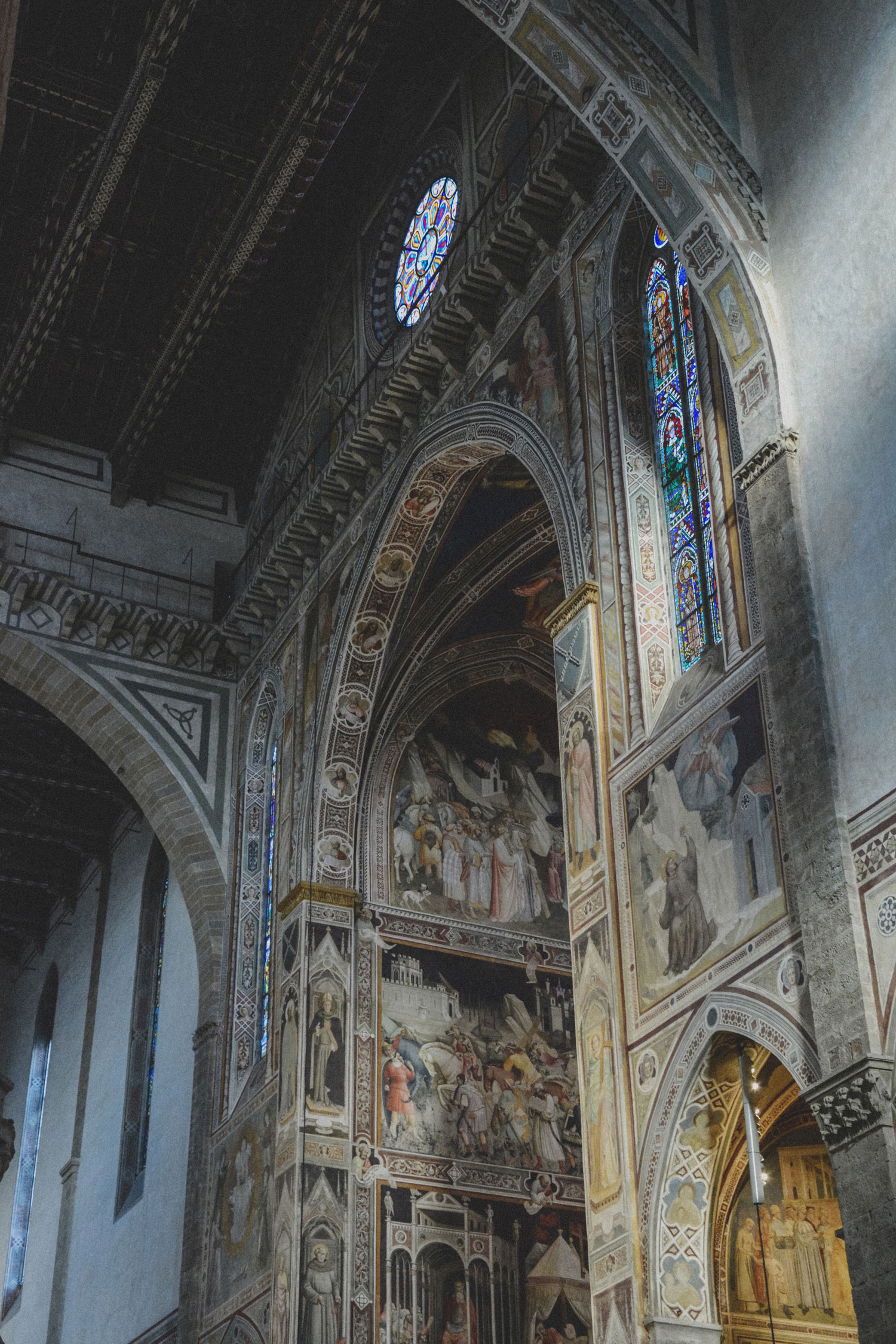 The fresco cycle shows scenes from the life of the Virgin Mary. Gaddi also designed the stained glass windows that allow natural light to flow in and illuminate the painted scenes.