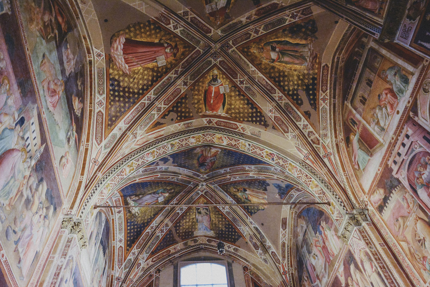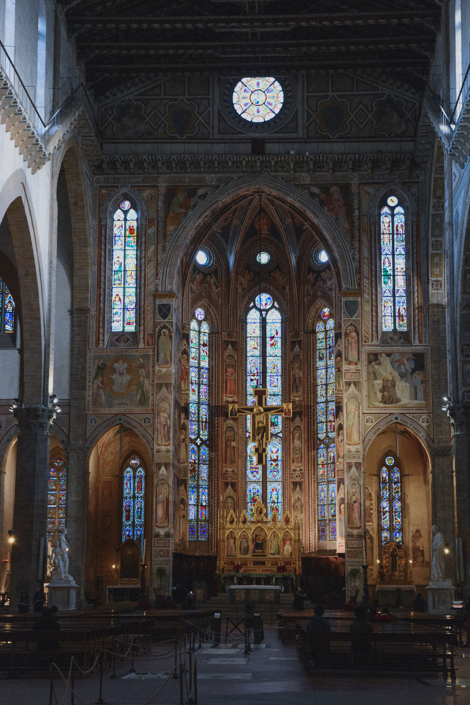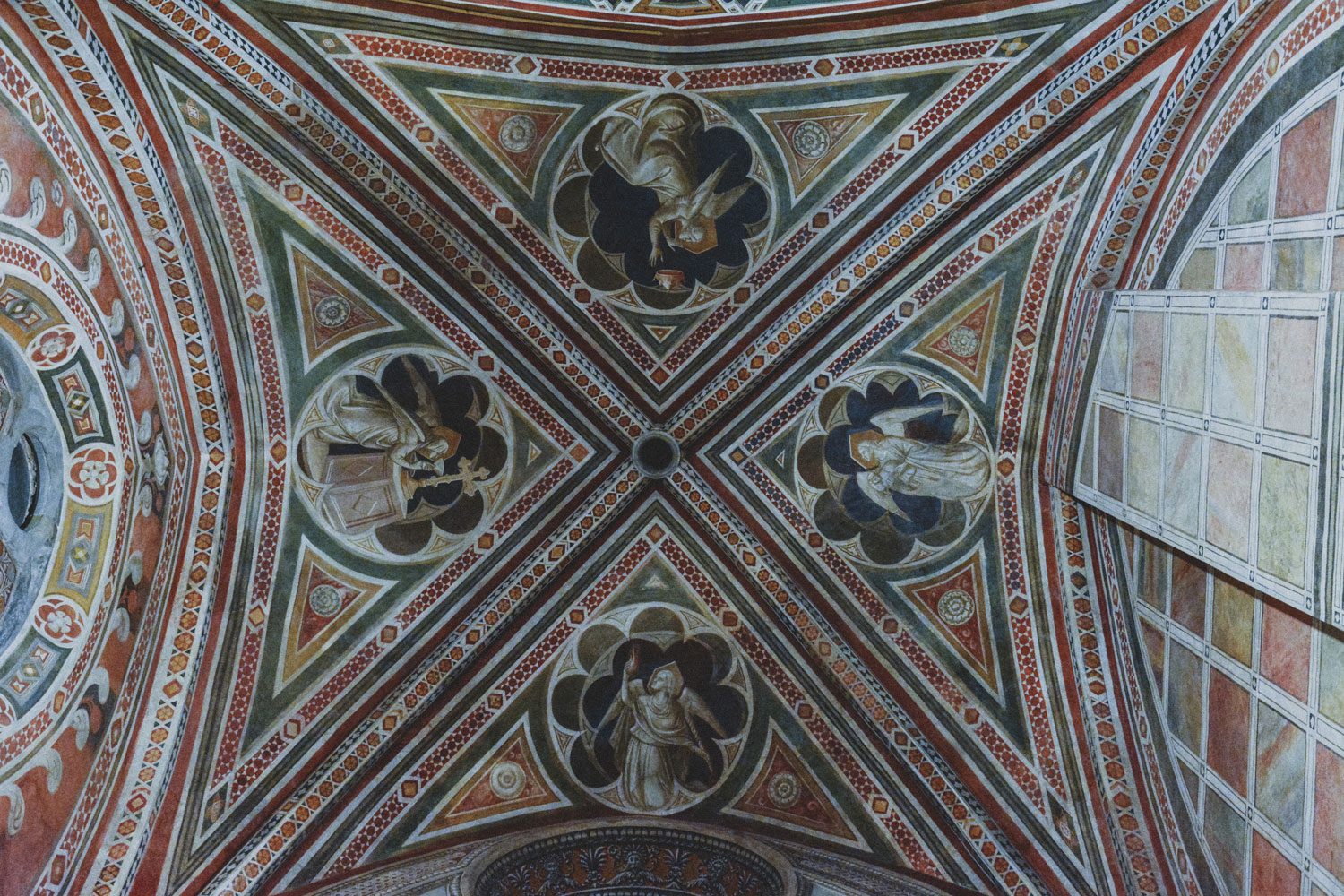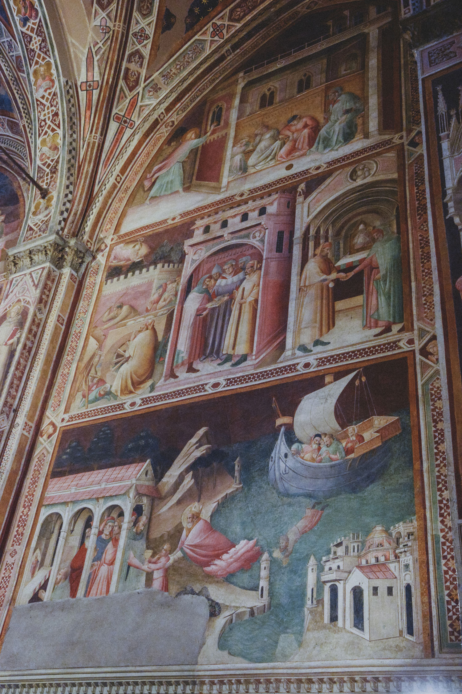 The fresco cycle shows scenes from the life of the Virgin Mary. Gaddi also designed the stained glass windows that allow natural light to flow in and illuminate the painted scenes.
