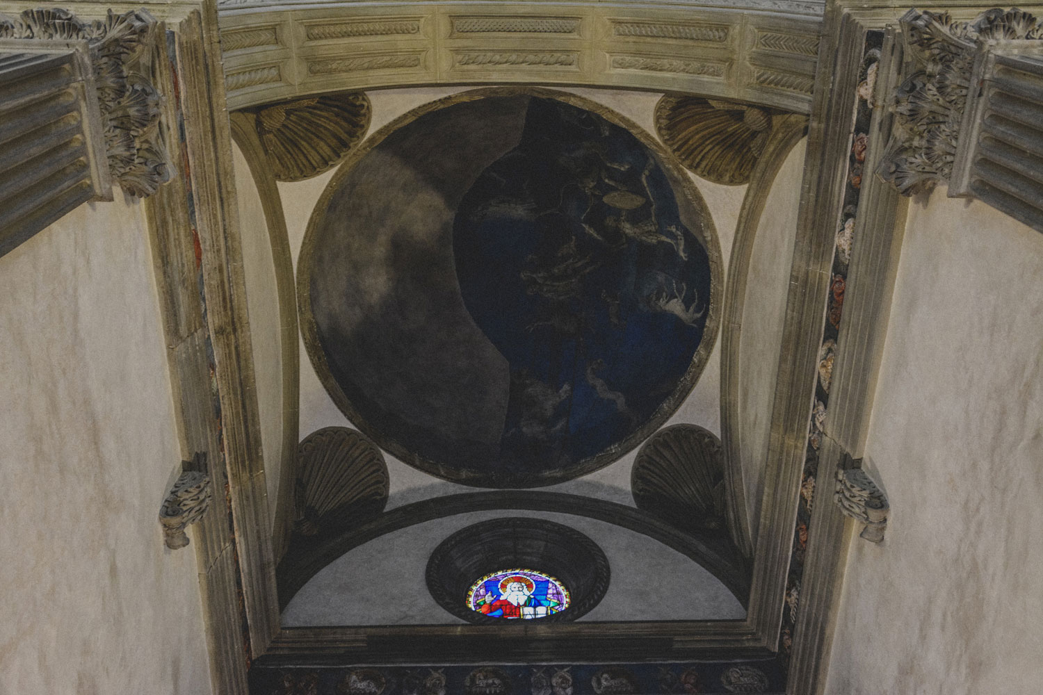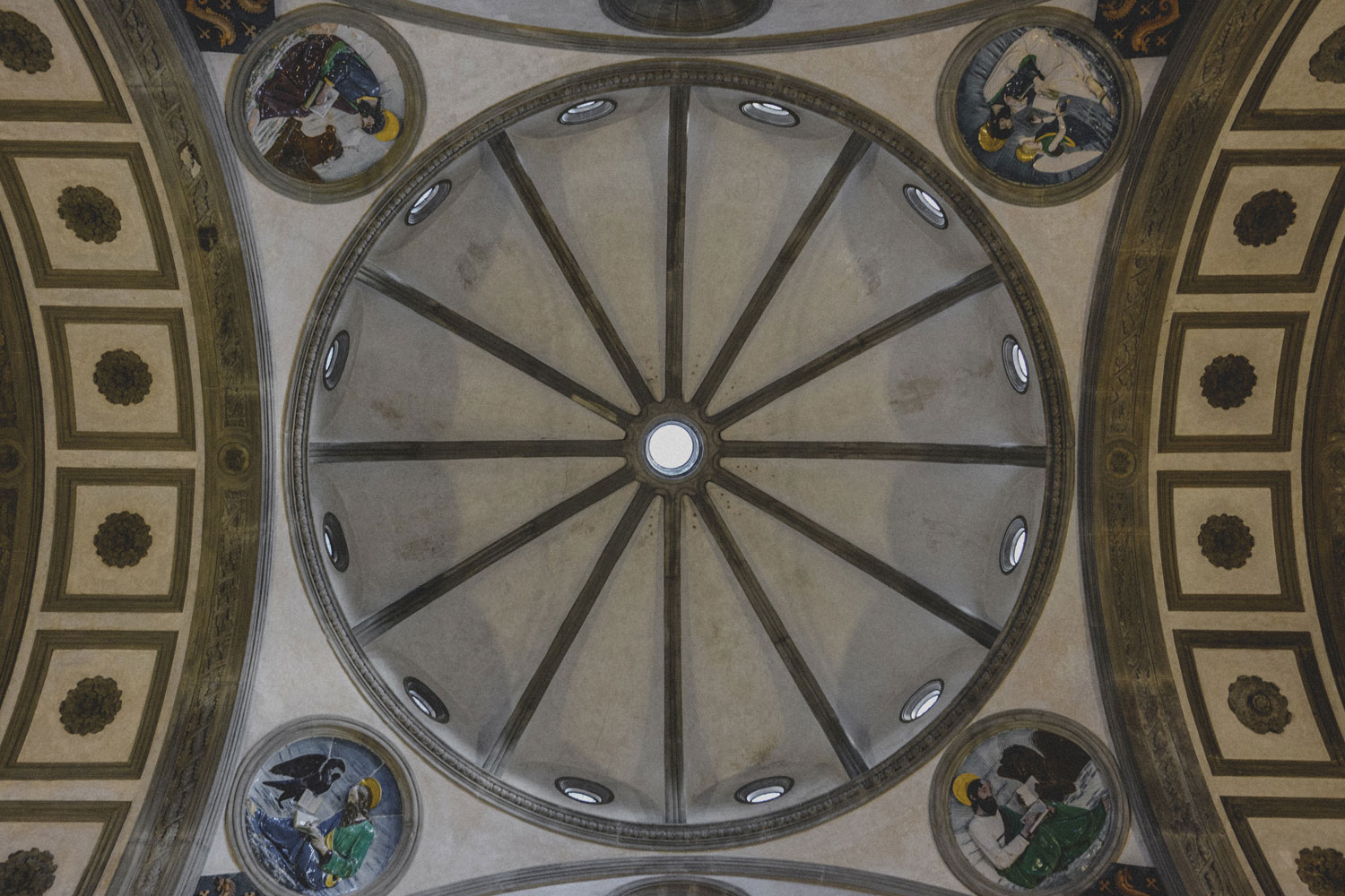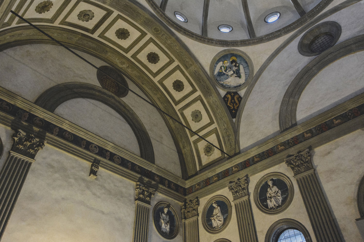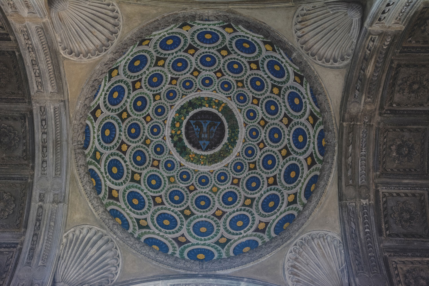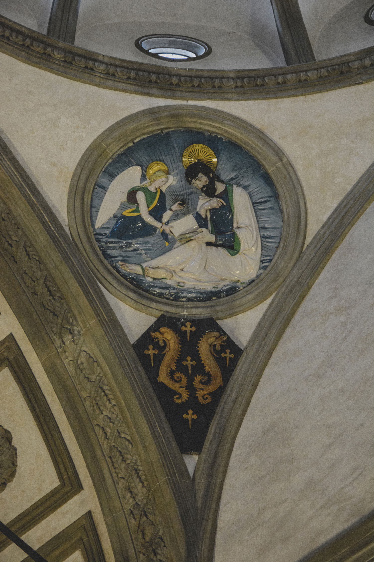 The tondi (the circular sculptures that dot the entire vault) of the Apostles were completed by Luca della Robbia. He also completed the terracotta decorations in the dome that crowns the porch of the chapel.