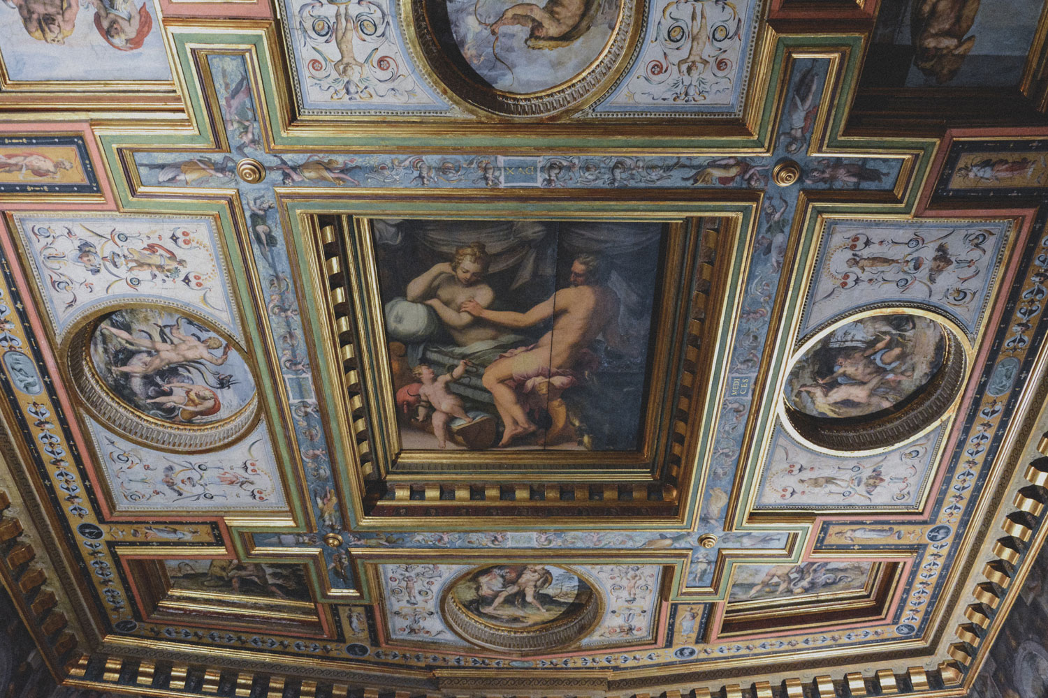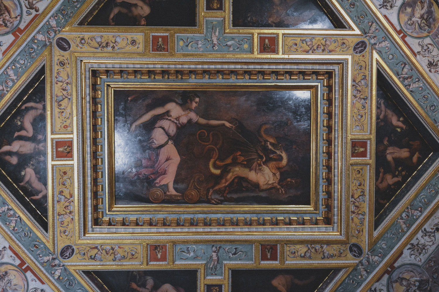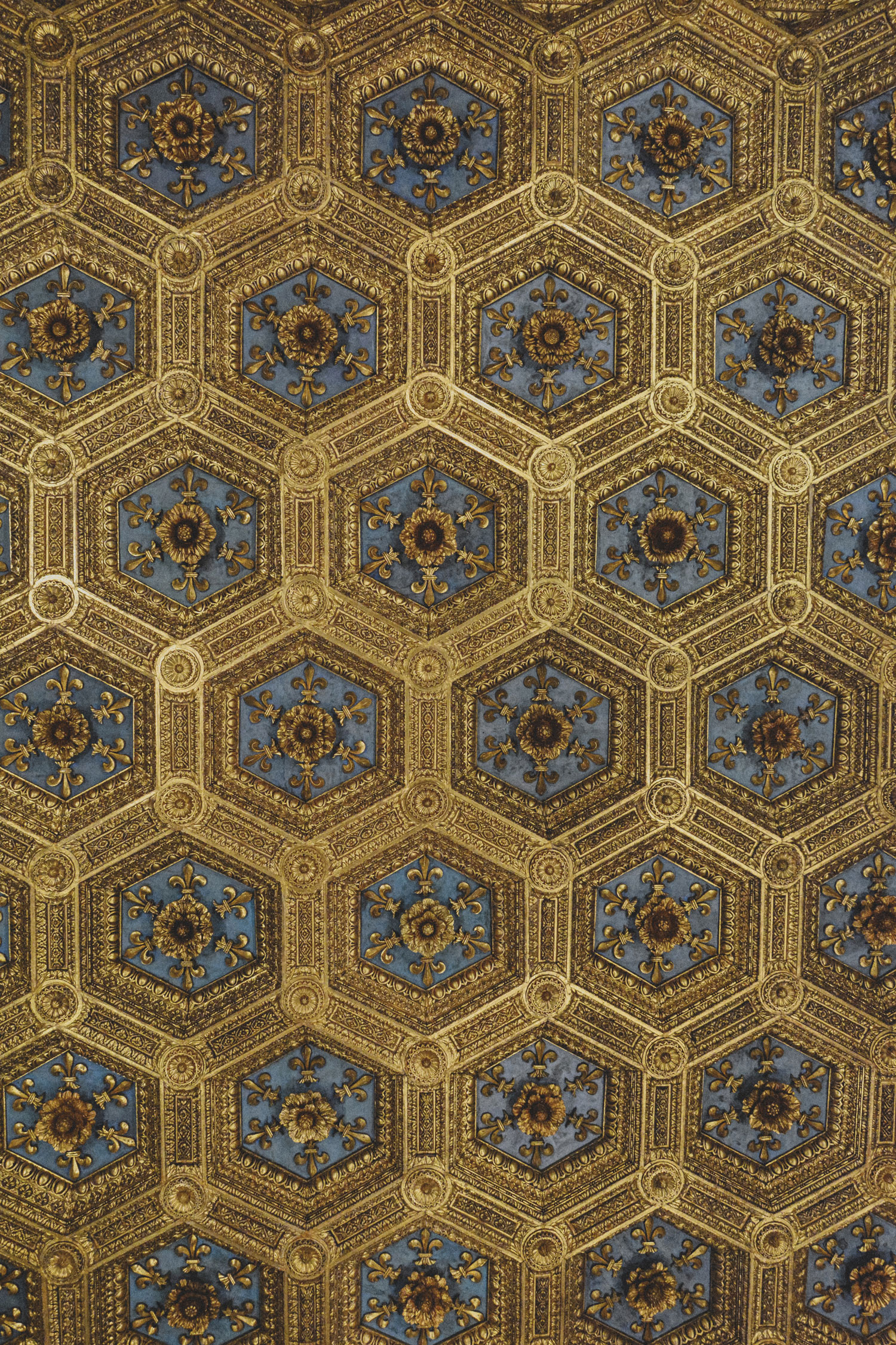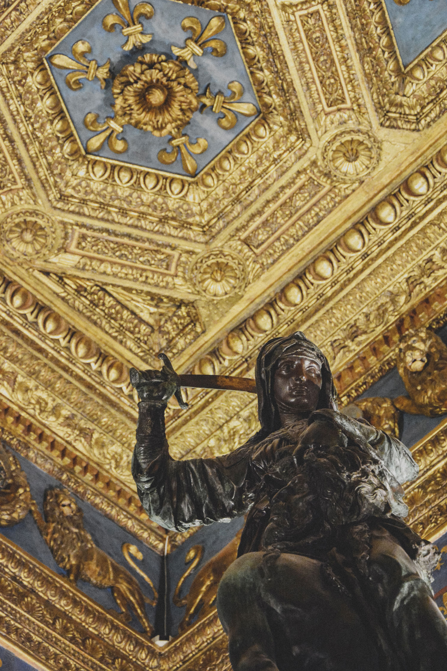 The Hall of the Lilies, as this room is known, is so called for the fleur-de-lys that decorate its walls. This choice in decoration was apparently made in order to refer to the good relations between Florence and the French Crown, and the frescoes on the other walls were made by the hand of Domenico Ghirlandaio. The room has, additionally, served as home to the original statue of Judith and Holofernes by Donatello since 1988. Also, that ceiling.