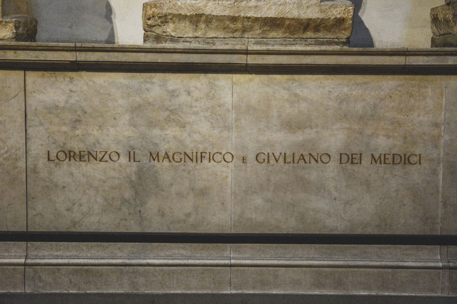 The original intent of the room was to hold four tombs, including those of Lorenzo Il Magnifico and his brother Giuliano (remember the Pazzi conspiracy?), who had been buried elsewhere. These tombs were never completed, and their remains were eventually moved into this modest monument. Ironic, since Lorenzo played a huge part in both Florentine history and in the growth of the Renaissance, while those immortalized by the grander monuments were relatively unknown and irrelevant, historically speaking.