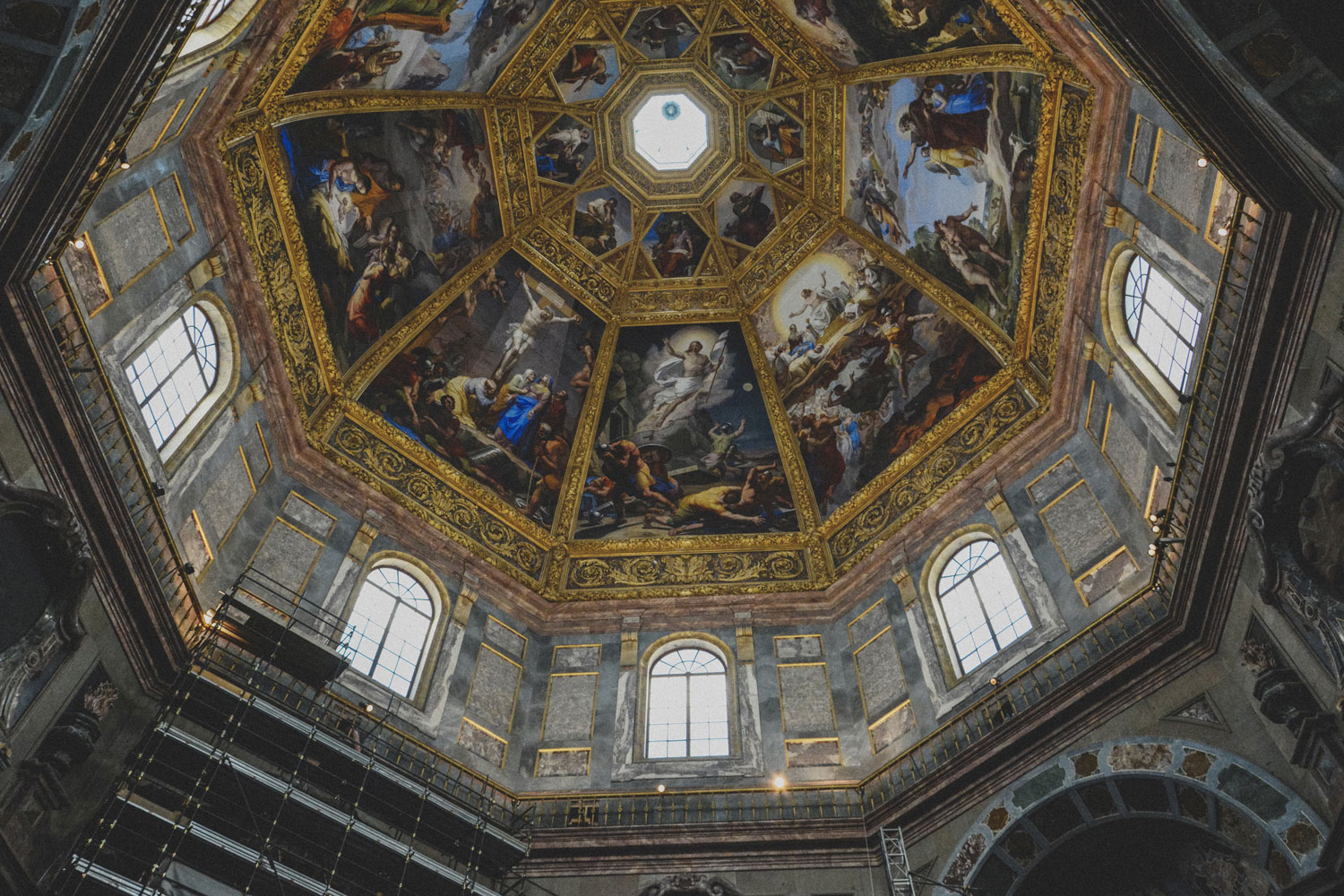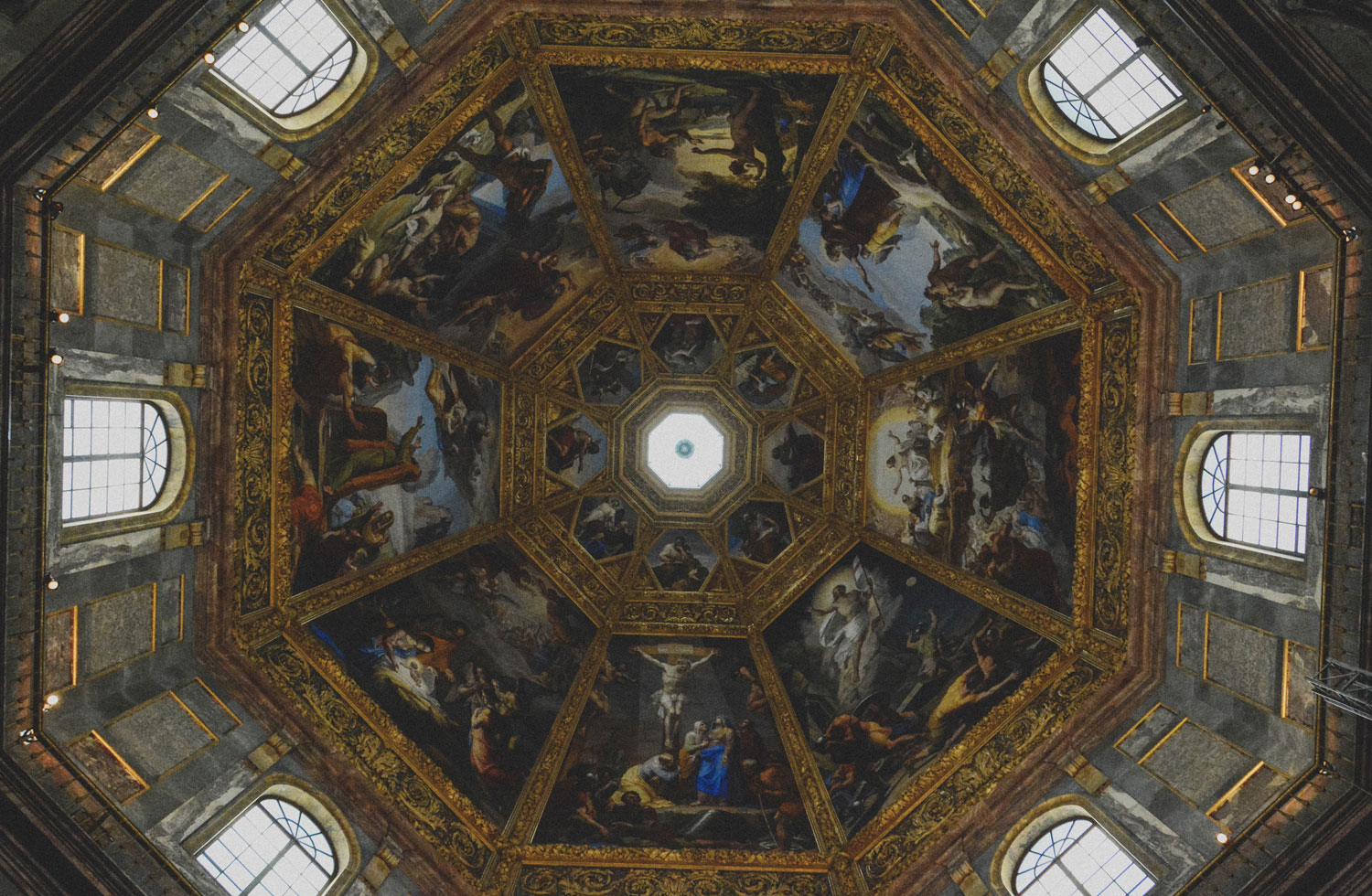 When you see the Basilica di San Lorenzo from the exterior, you will notice that the building is distinguished from its surroundings by an impressive dome. What you see in this image is the interior of said dome.