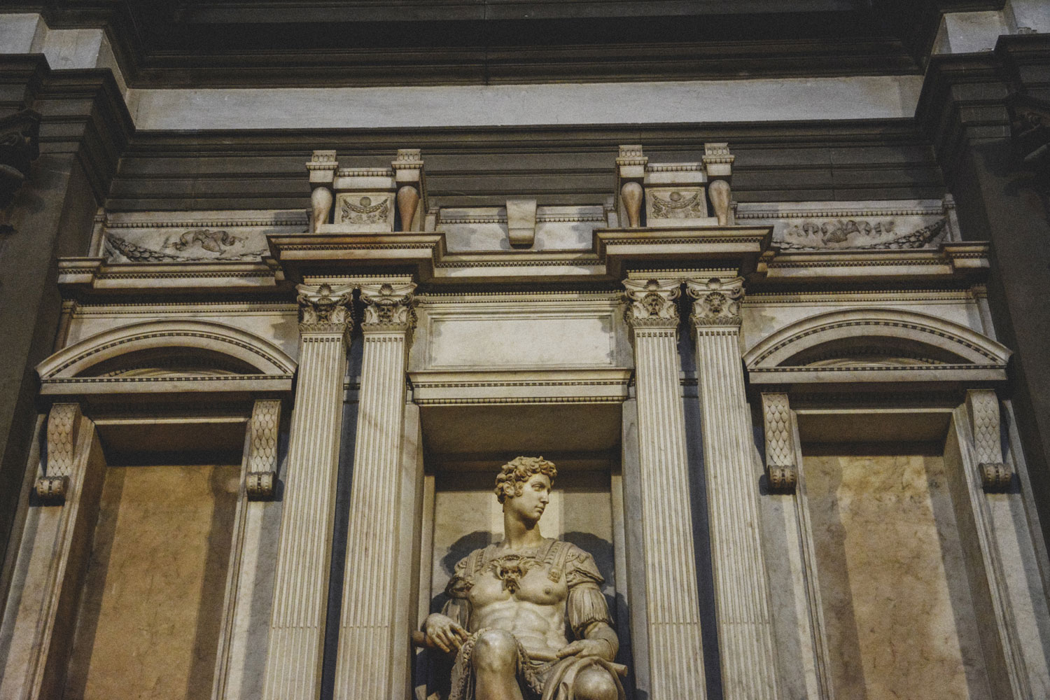 The tombs are flanked by four figures known conjunctively as “Times of Day.” Giuliano’s tomb is flanked by “Day” and “Night,” and Lorenzo’s by “Dusk” and “Dawn.”