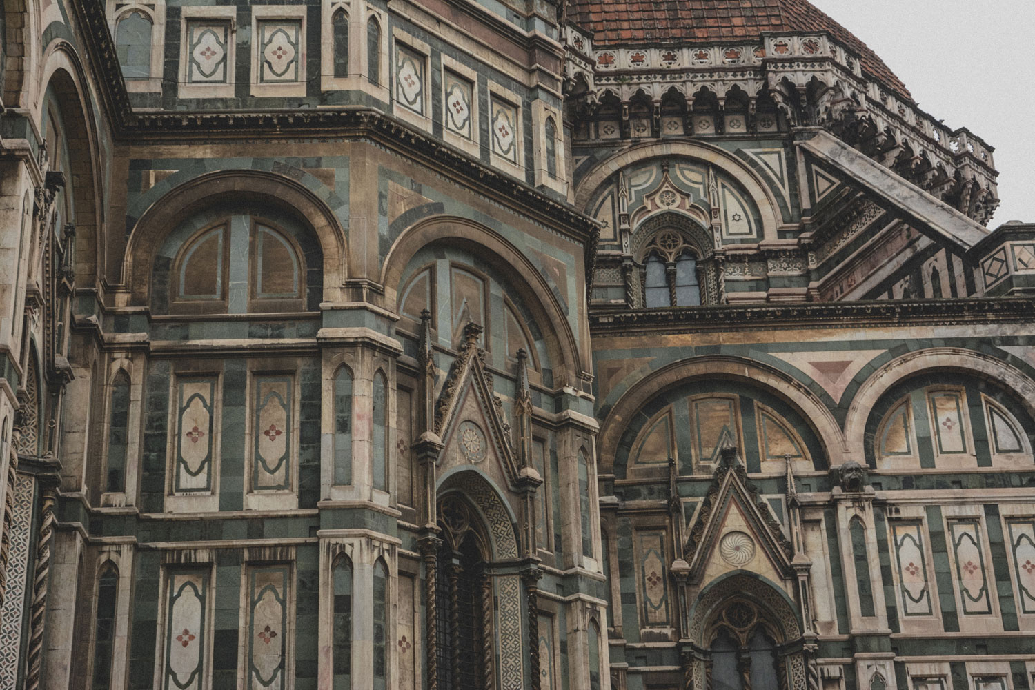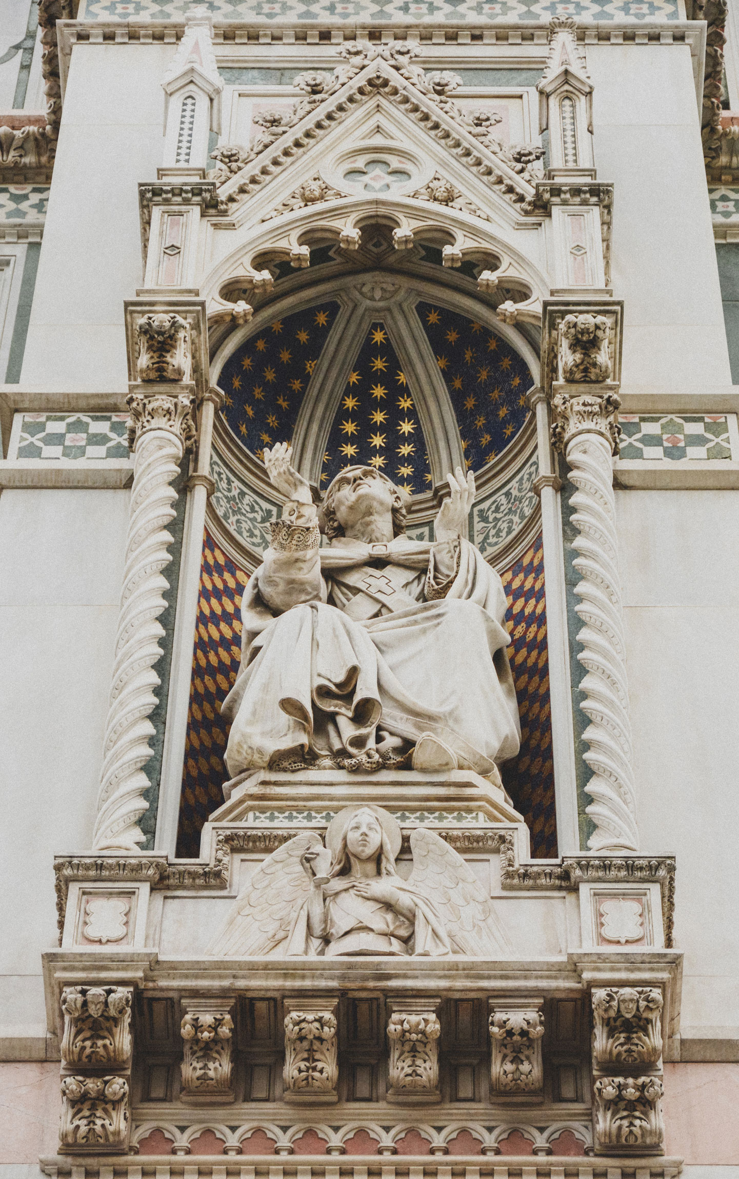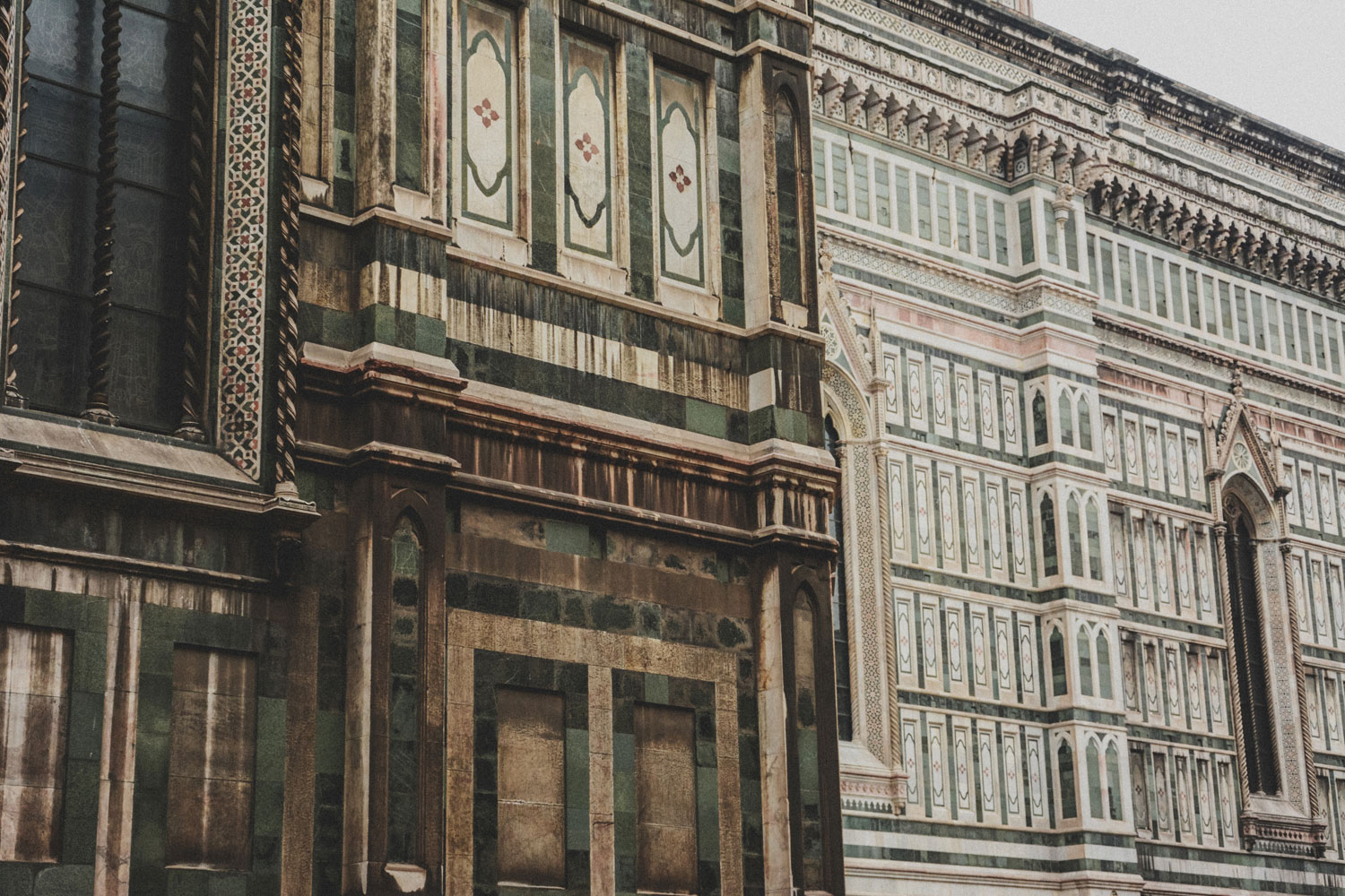 The decoration of the exterior of the cathedral was not completed until 1887, its polychrome marble a design by Emilio de Fabris.