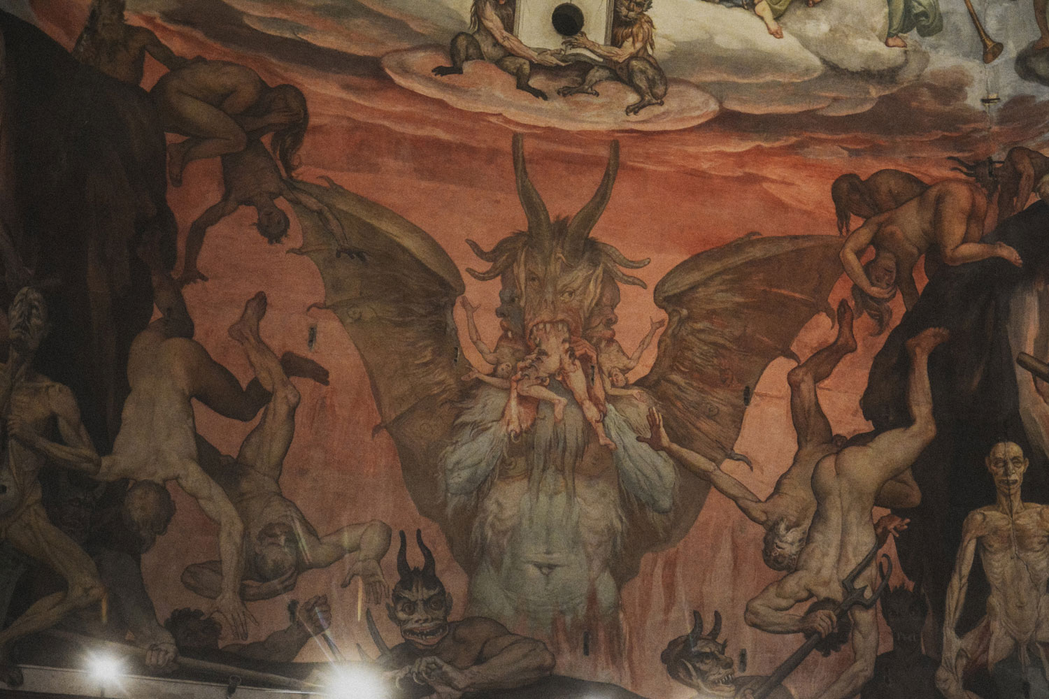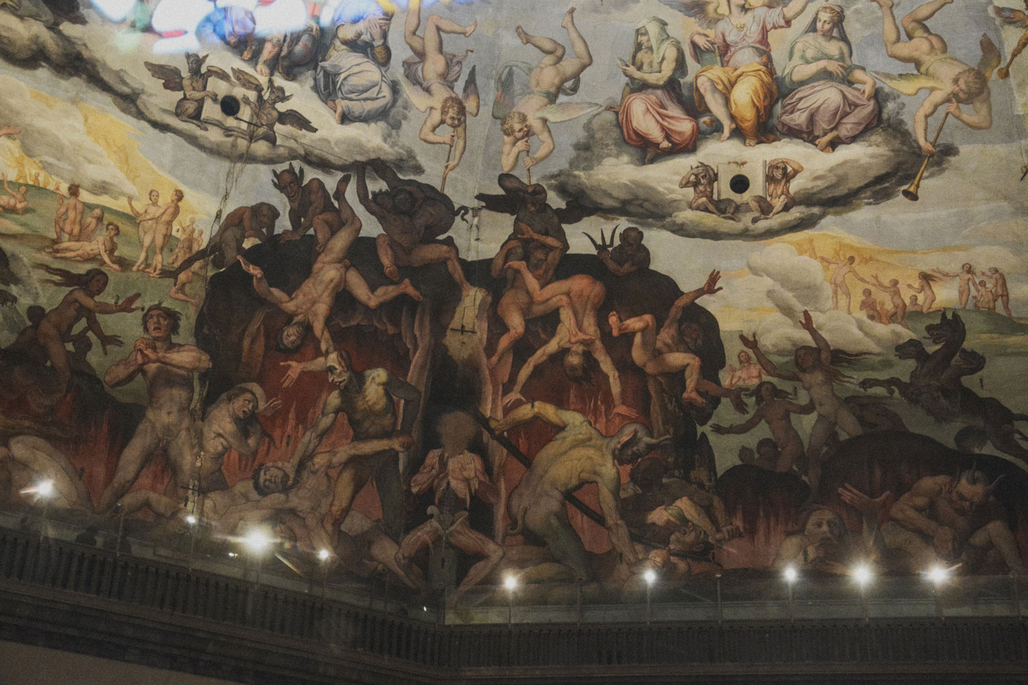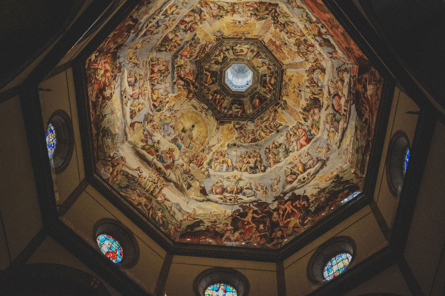 It was Brunelleschi’s hope that the interior of the dome would be covered in gold mosaics, which would have made the most of the available light coming in through the circular windows and the lantern at the cusp. After his death, however, that part of the project was scrapped, and the dome’s interior walls were whitewashed. It was Grand Duke Cosimo I de’ Medici who decided to commission Giorgio Vasari and Federico Zuccari to cover it with a representation of the Last Judgment. The quality of the work is uneven because while Vasari used true fresco (which painted onto wet plaster), Zuccari used in secco (which painted onto it dry).