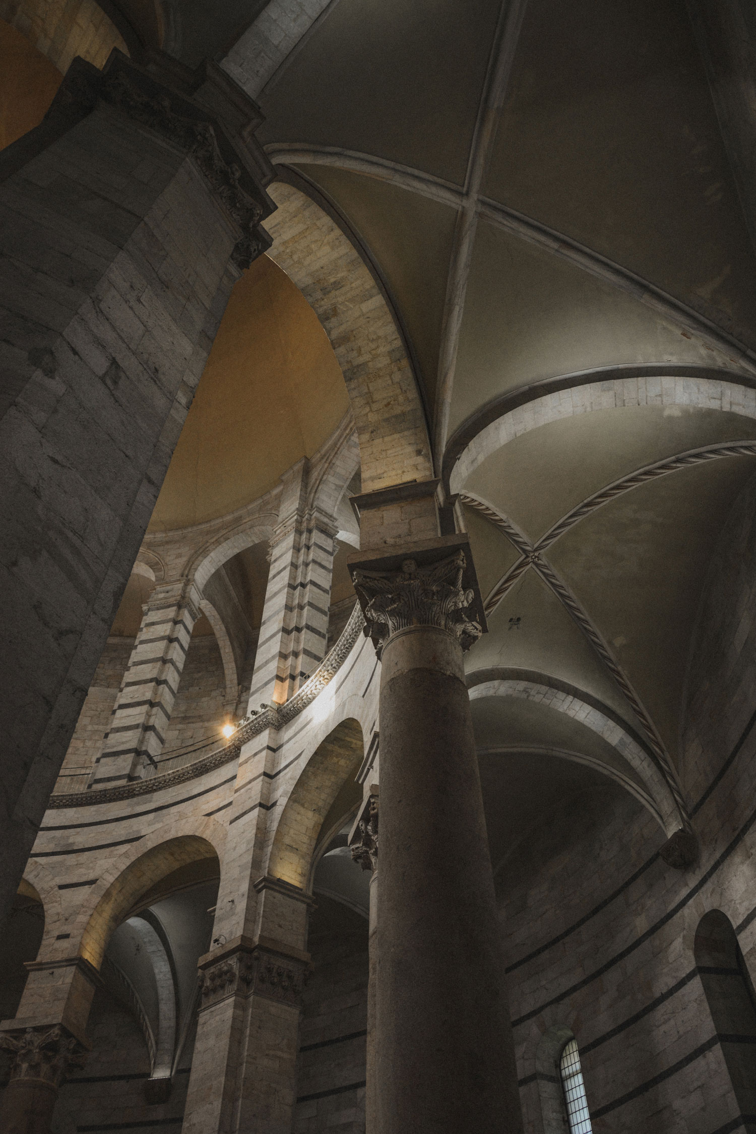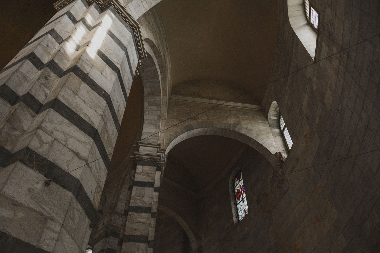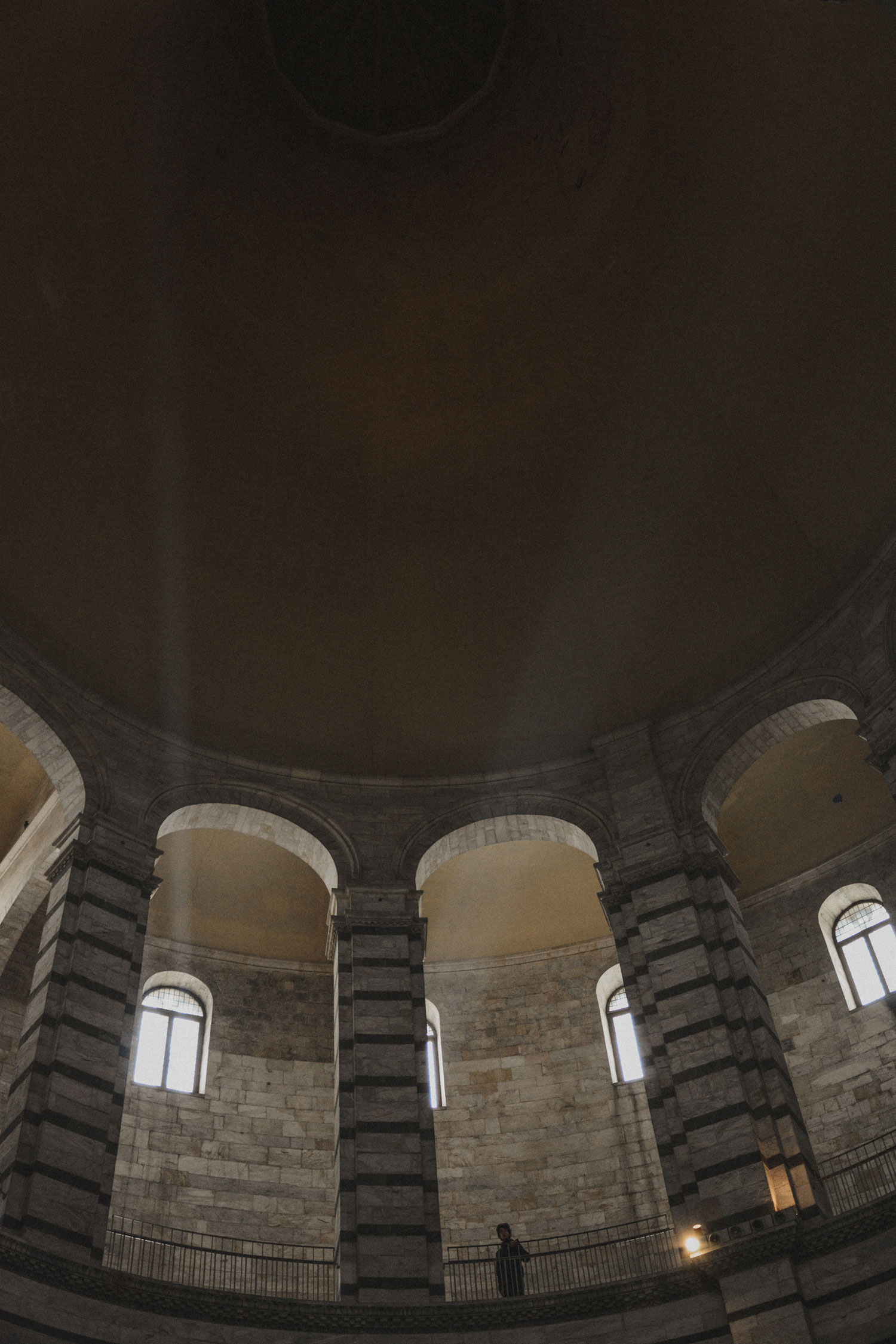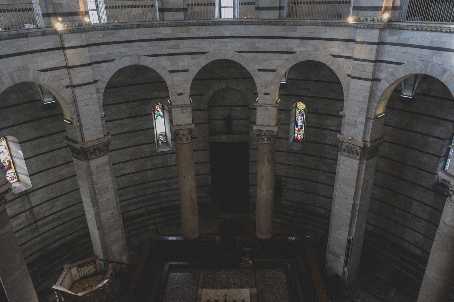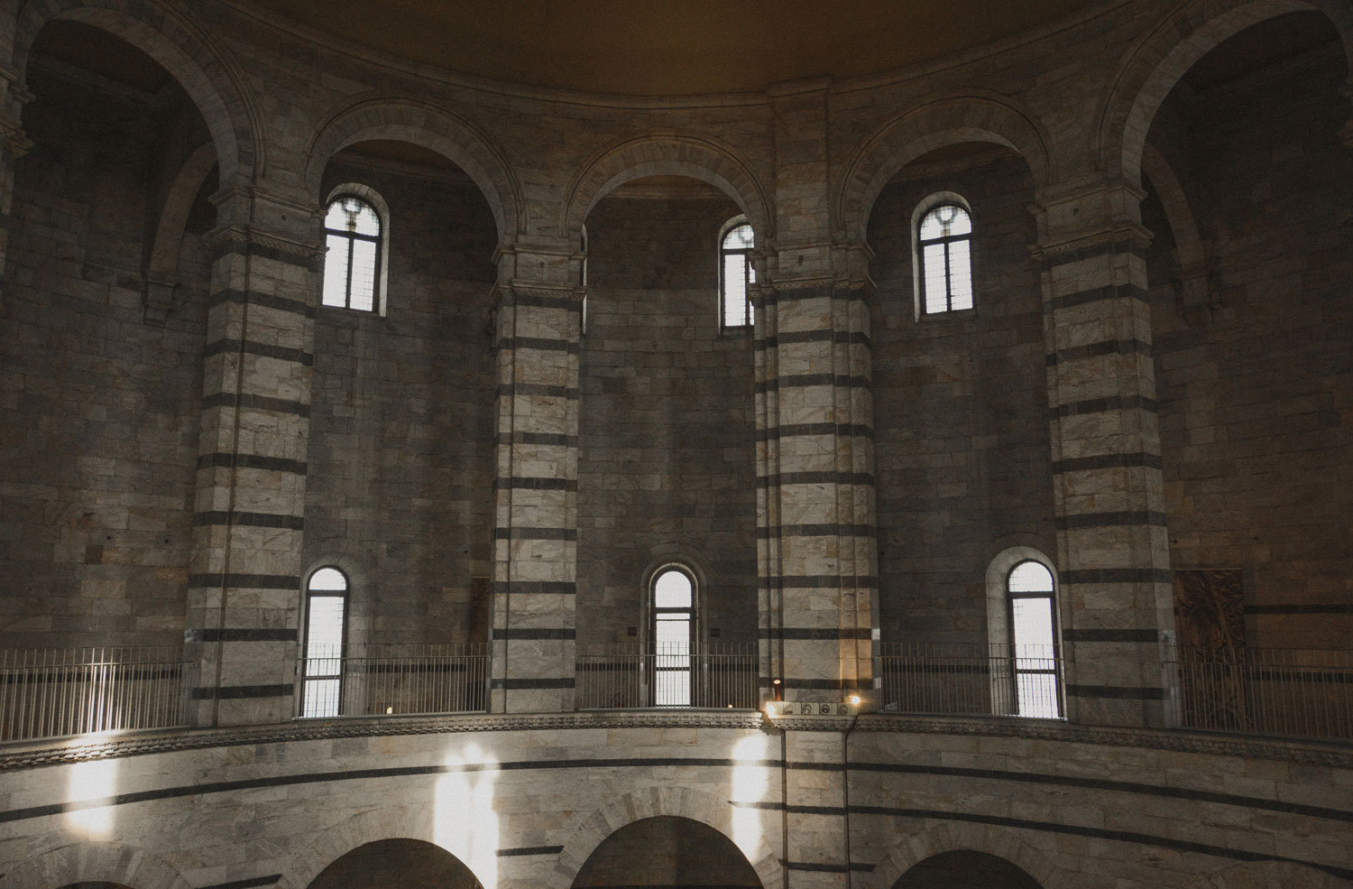 While the exterior of the Pisa Baptistry is brimming with carvings and detail, its interior is much more austere. Construction of this building began in 1152 to replace an older baptistery that had stood in its place, and was designed by Diotisalvi, a local architect.
