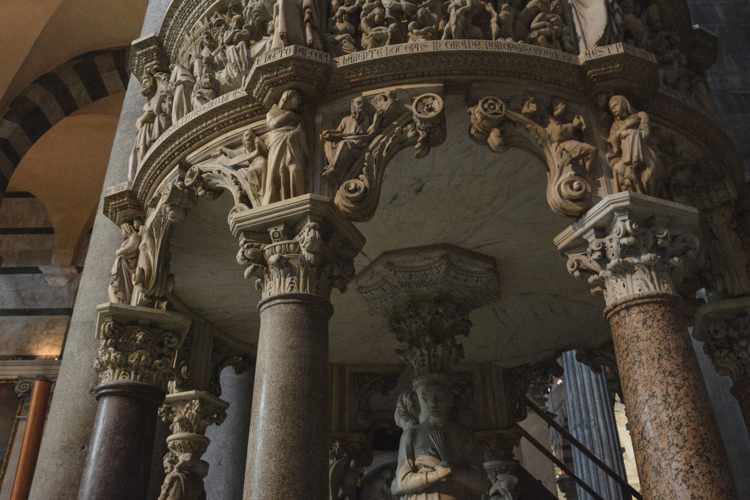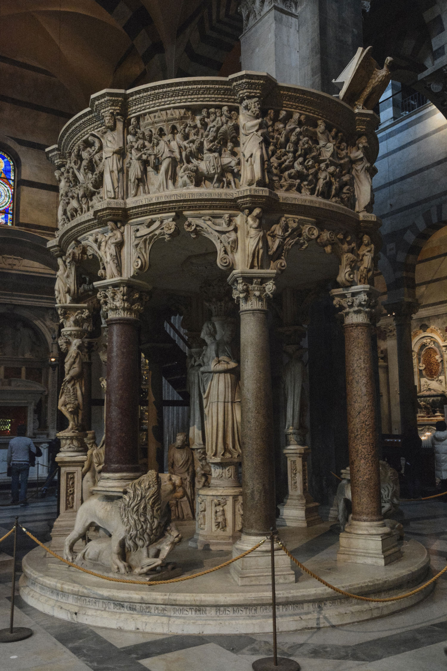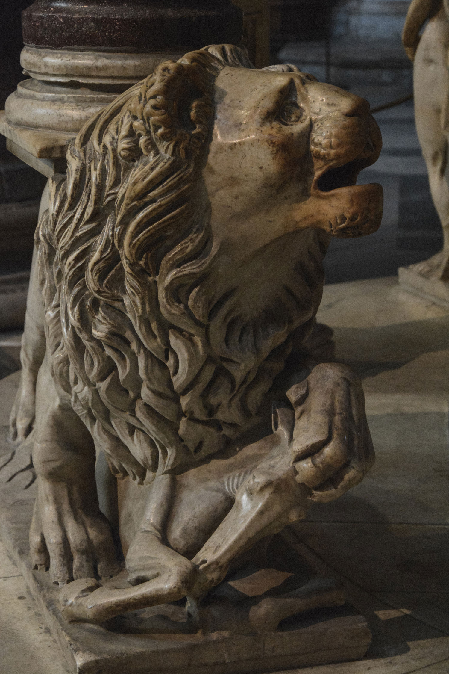 The pulpit, which as I mentioned here was designed by Giovanni Pisano, also survived the fire but was taken apart during the restoration work that followed it. It wasn’t until 1926 that it was put back together, and, due to lack of documentation, it’s possible that it’s neither standing in its original spot nor were its pieces fit back together in their original order.