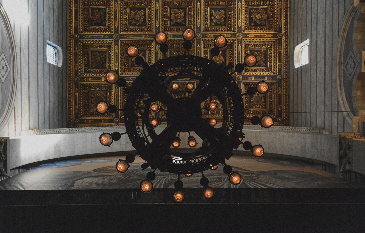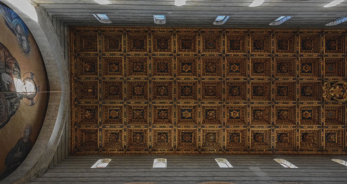 This mosaic (what you see here is a photo, since conservation work on the ceiling was covering its view from the other end of the nave) shows Christ enthroned between the Virgin Mary and Saint John. It was completed by Cimabue in the early fourteenth century, and survived the fire that destroyed much of the church roof in the late sixteenth century. It was translated into mosaic by Francesco da Pisa and Vincino da Pistoia, and finally completed in 1320.
