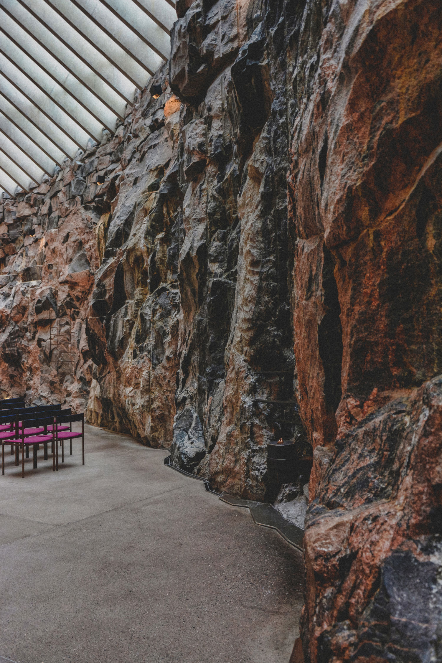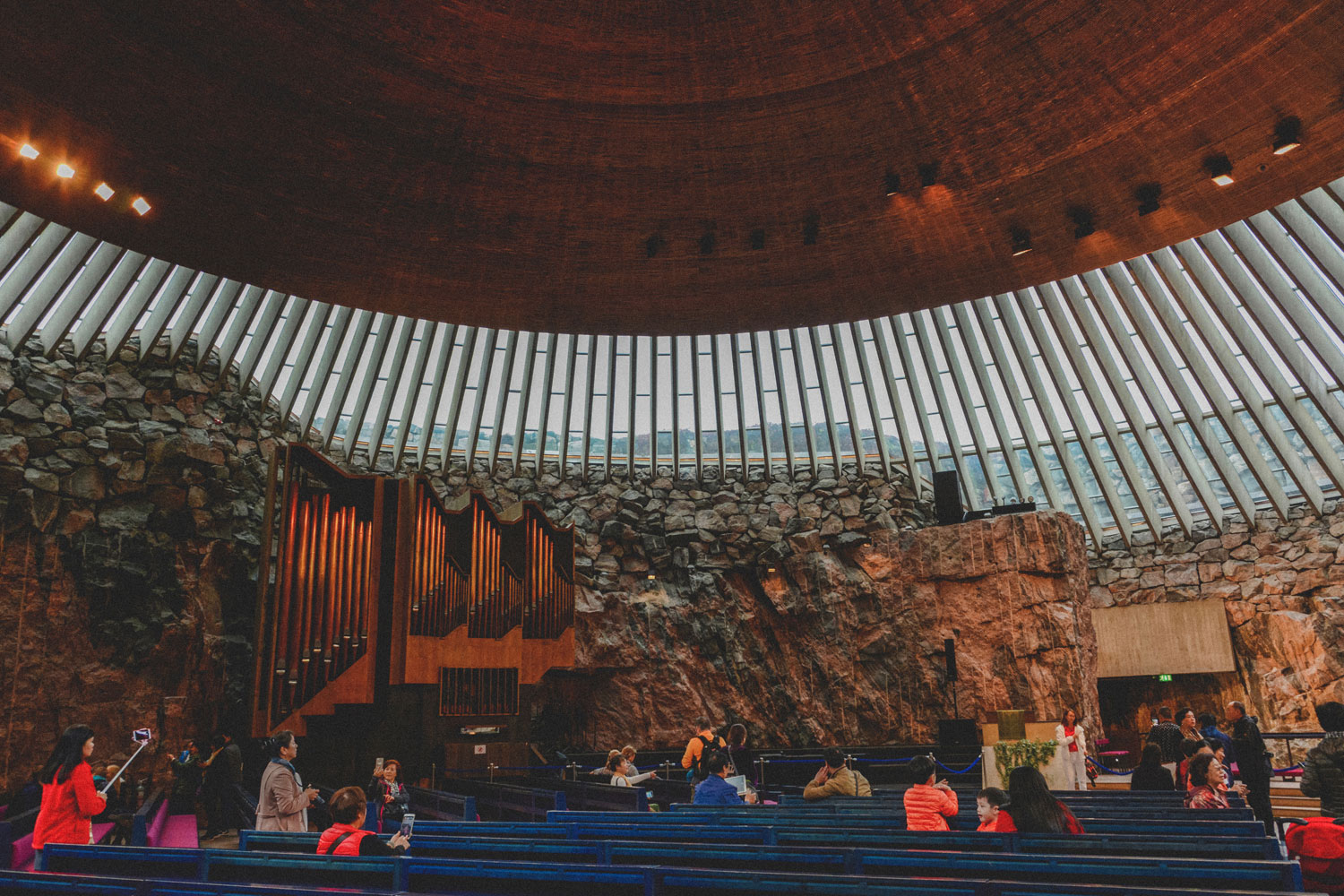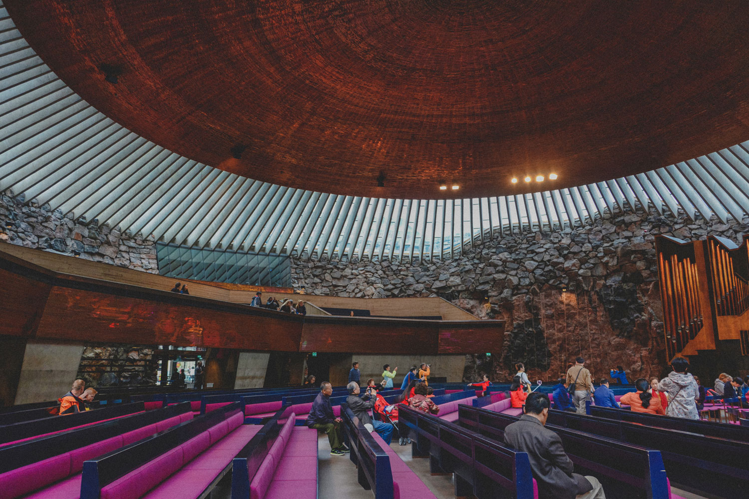 Apparently it had not been part of the original design to leave the rock walls exposed, as the architects believed it would be too radical for the jury. Once they looked more into how to perfect the acoustics, however, they realized it could be done by keeping the original rock wall. The acoustics are so good that the interior of the church is known for them, and the building is often used as a concert venue.