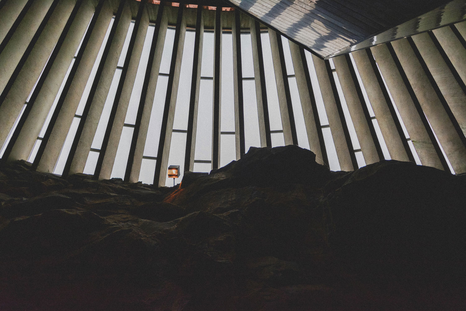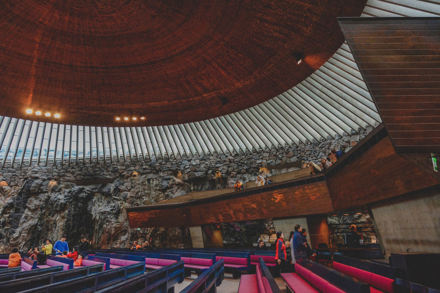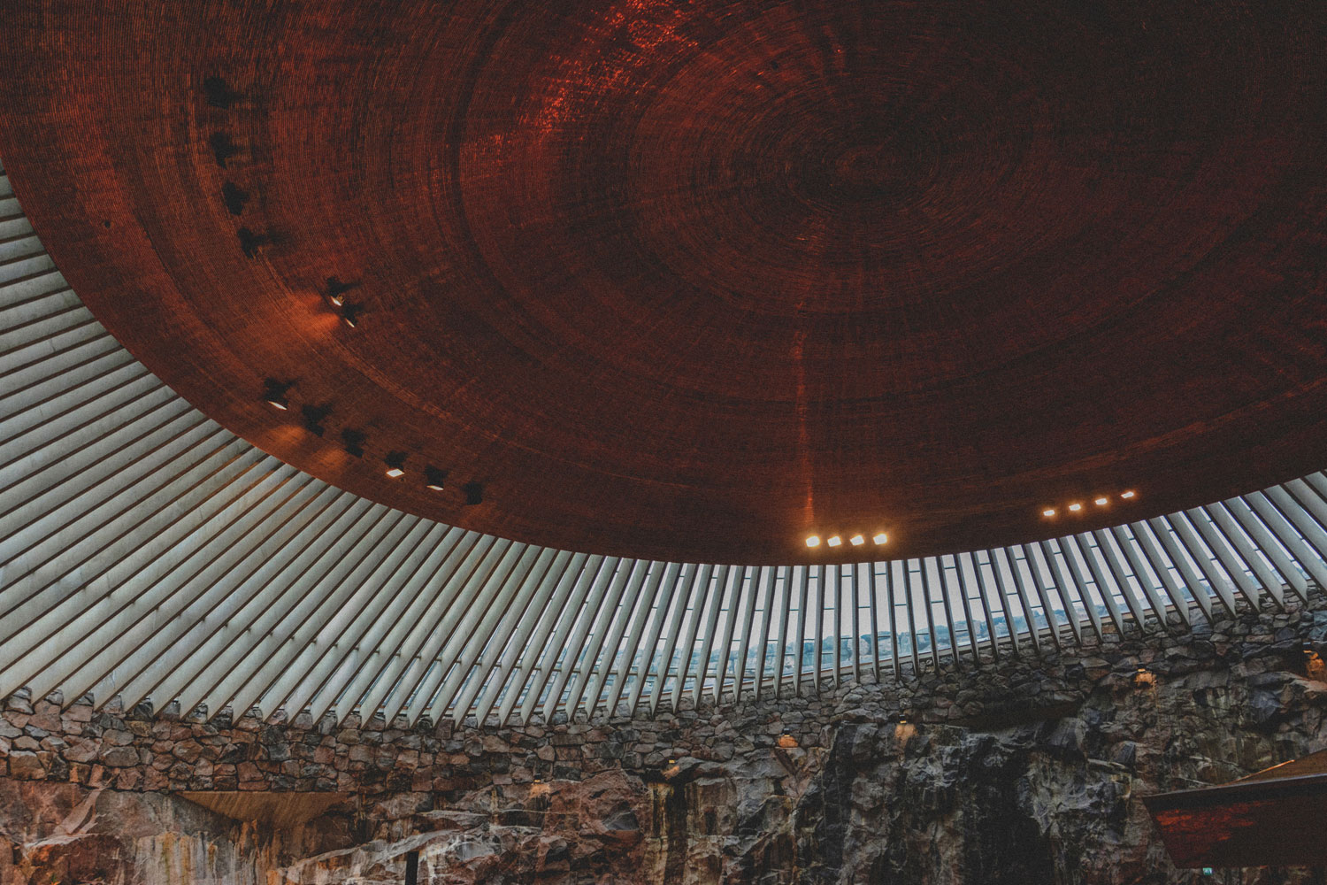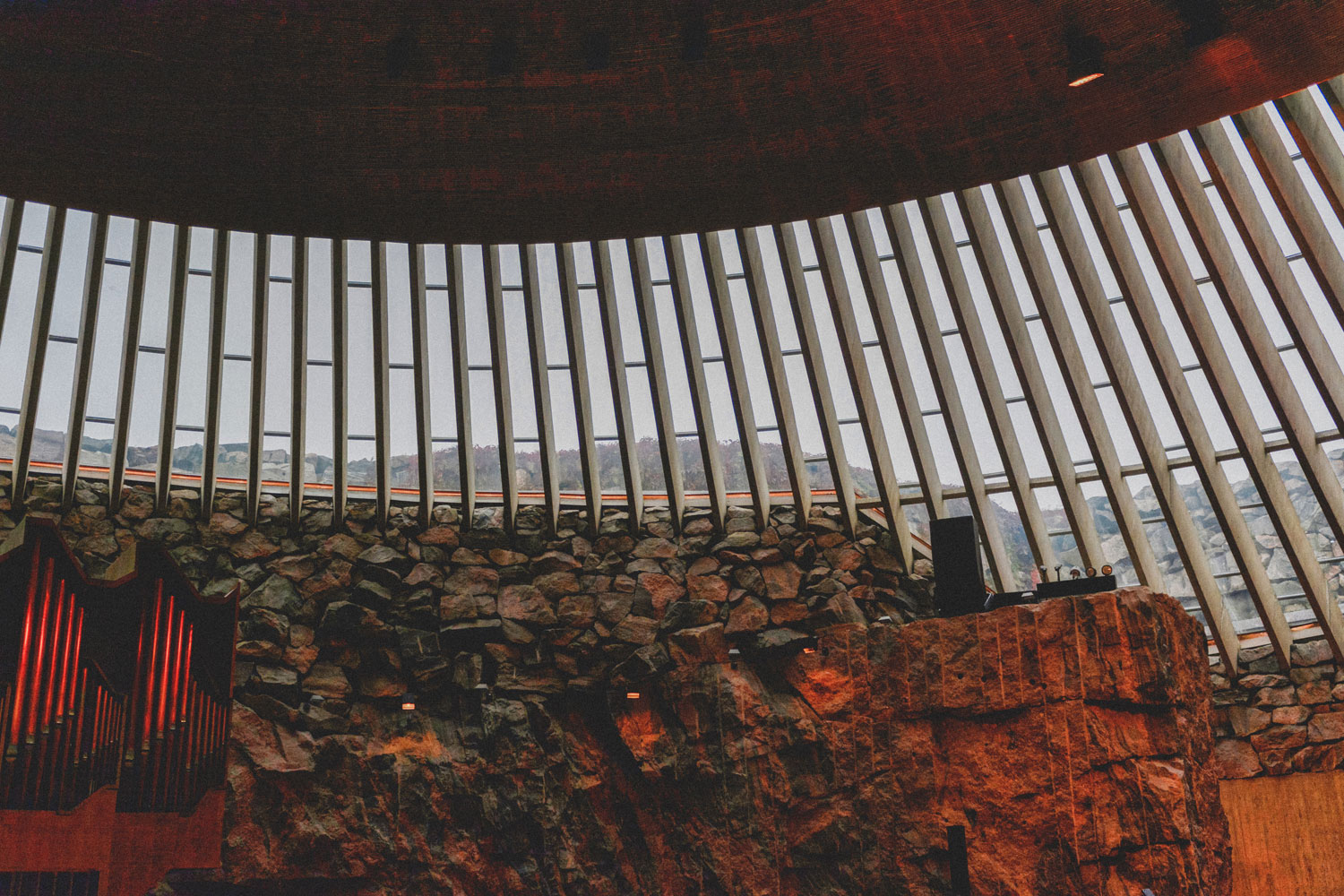 Apparently it had not been part of the original design to leave the rock walls exposed, as the architects believed it would be too radical for the jury. Once they looked more into how to perfect the acoustics, however, they realized it could be done by keeping the original rock wall. The acoustics are so good that the interior of the church is known for them, and the building is often used as a concert venue.